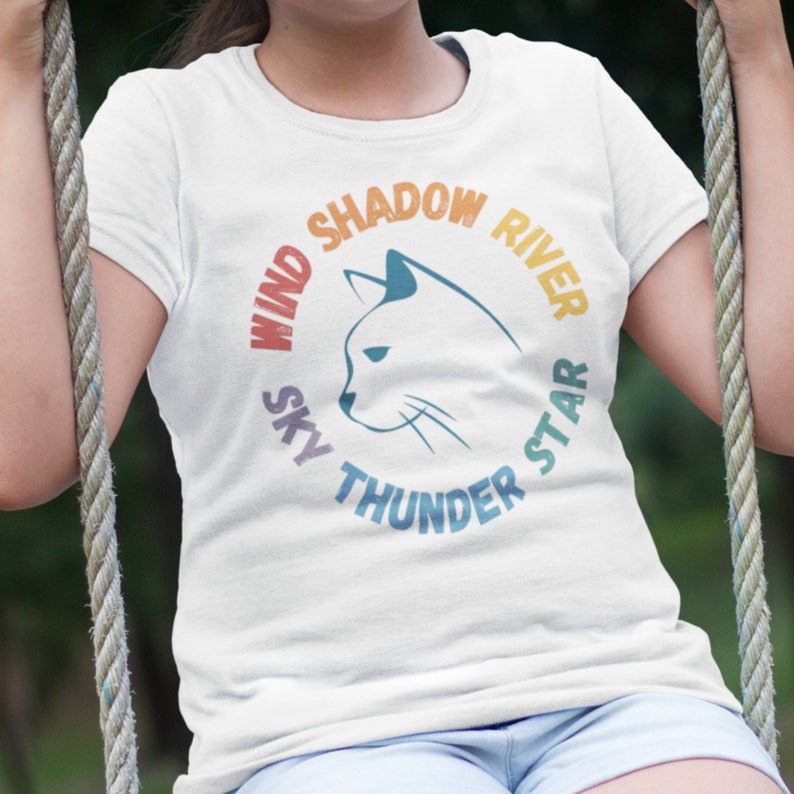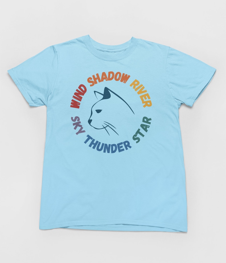 The black shirt has a light-colored cat in the center. The light shirts have a dark-blue cat in the center.