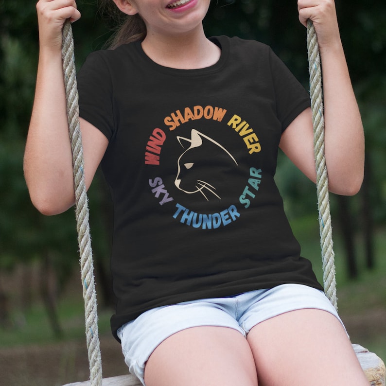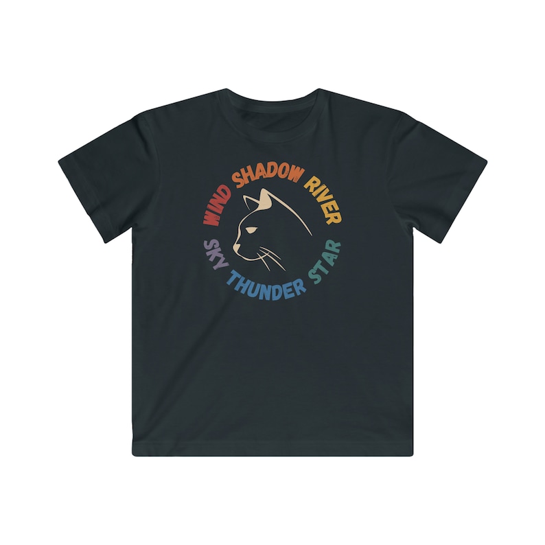 The black shirt has a light-colored cat in the center. The light shirts have a dark-blue cat in the center.