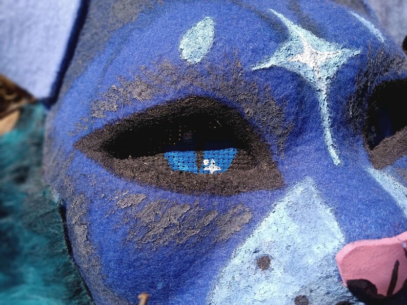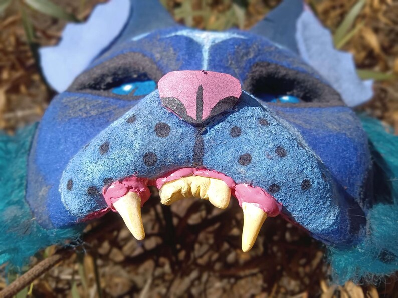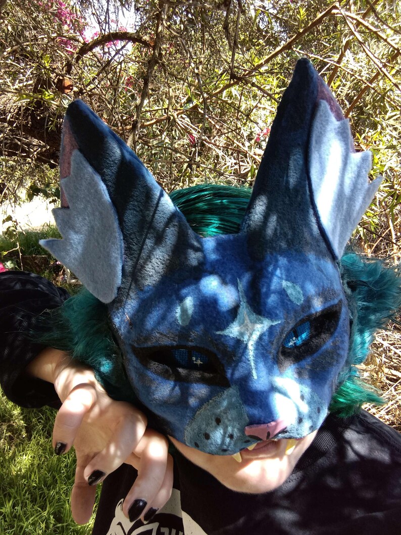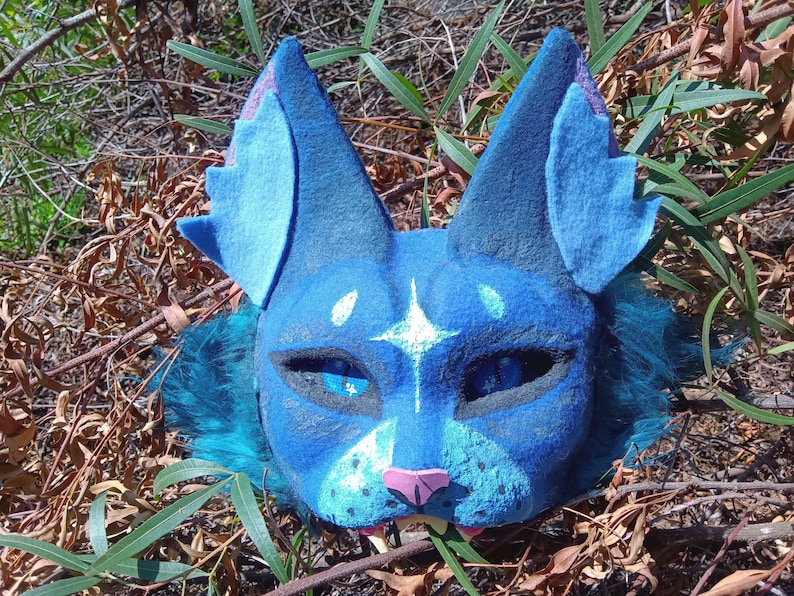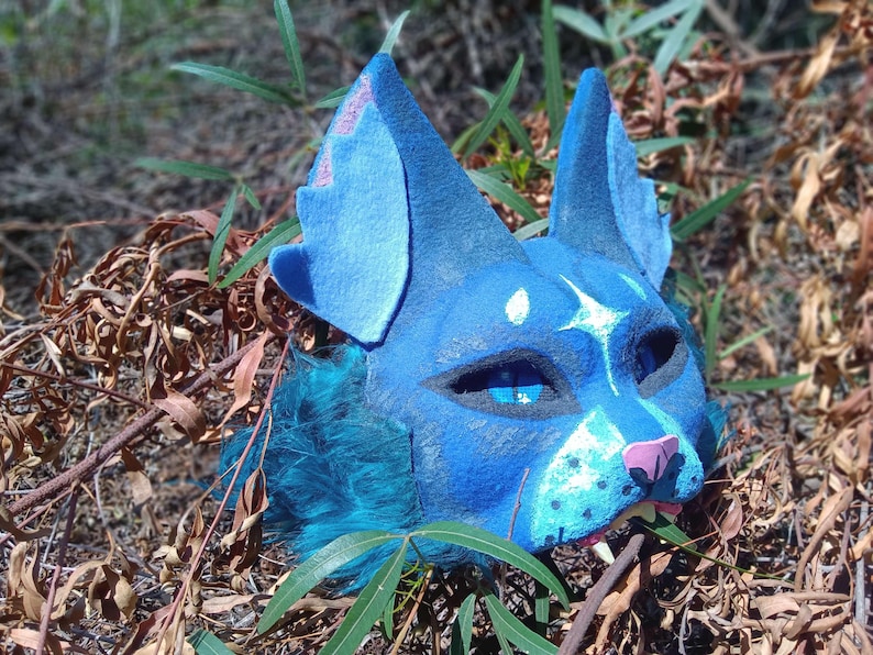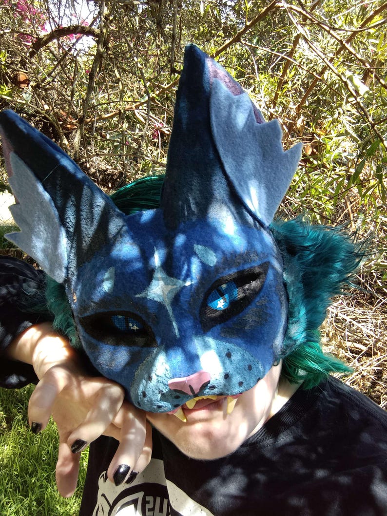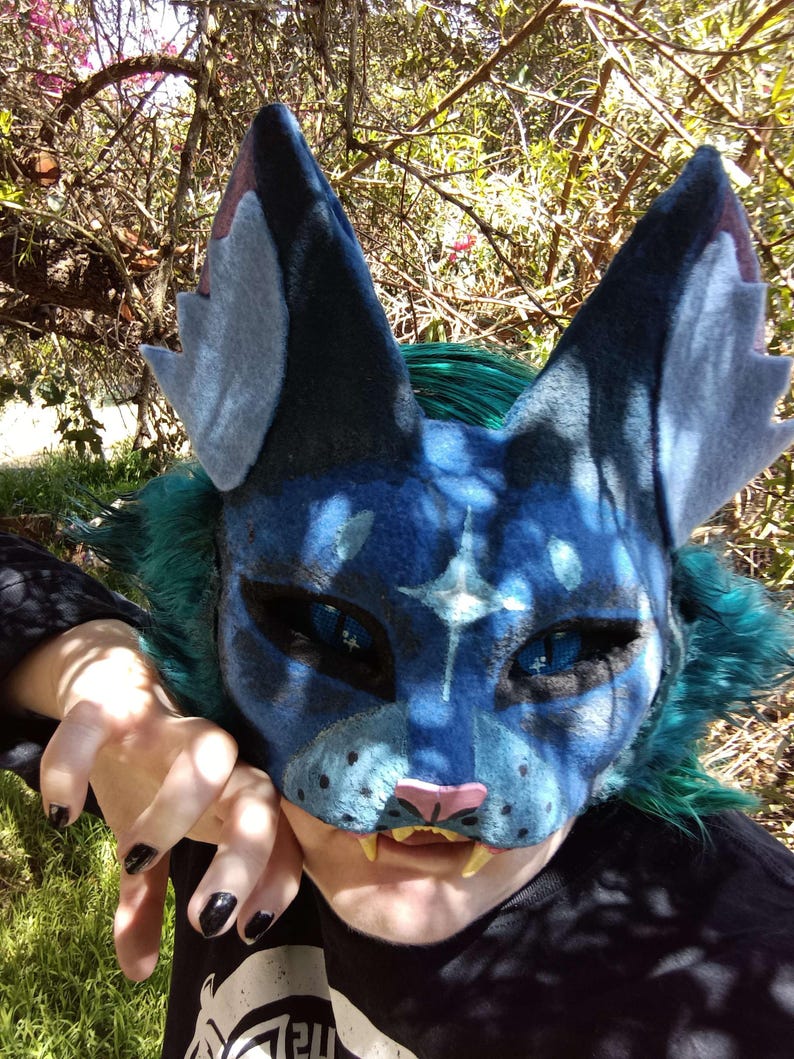 This mask is inspired by therian-style masks, meaning that paper cat masks are used as a base while material is glued over it and then hand painted to create an entirely new animal mask.