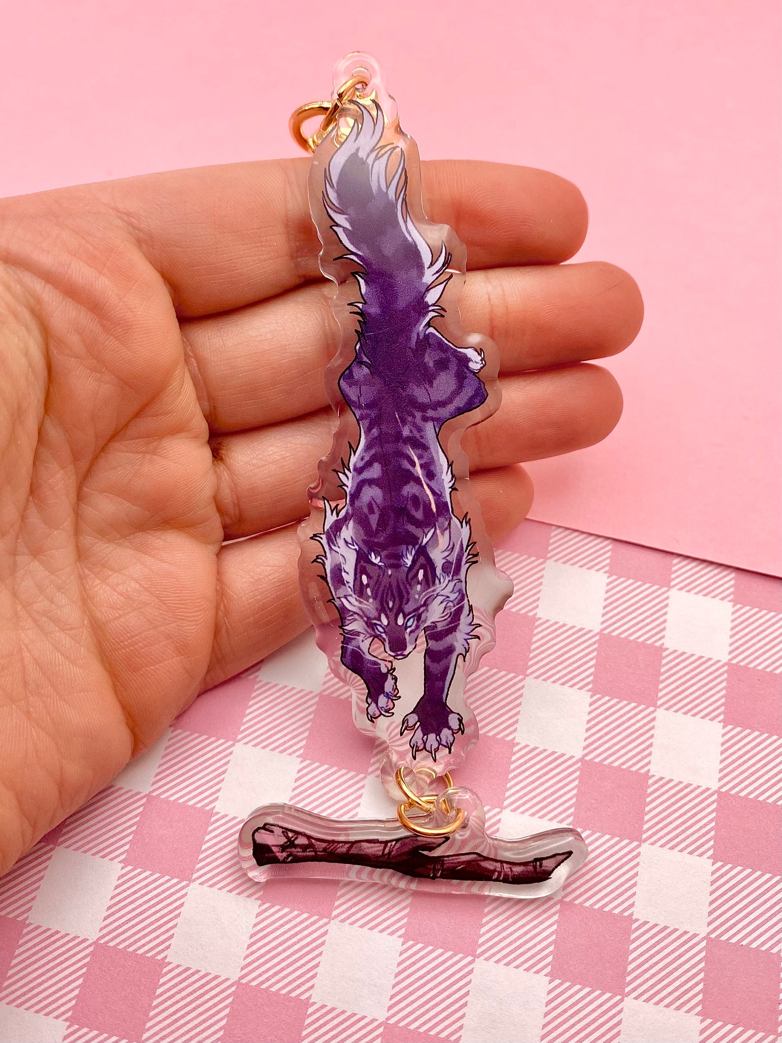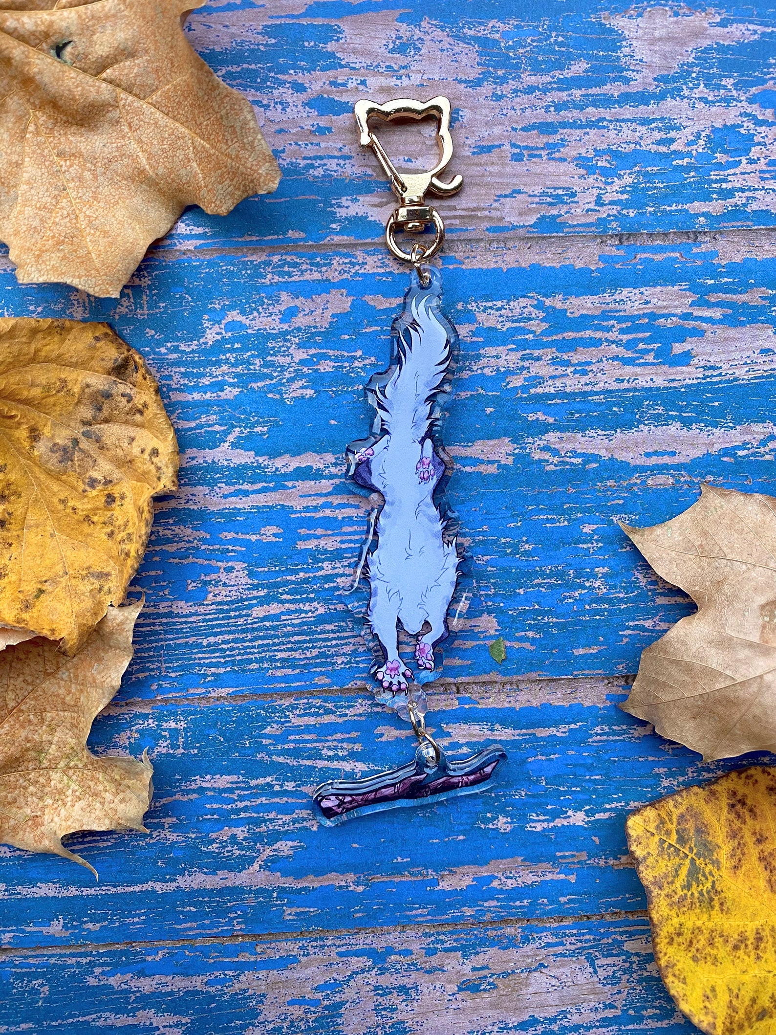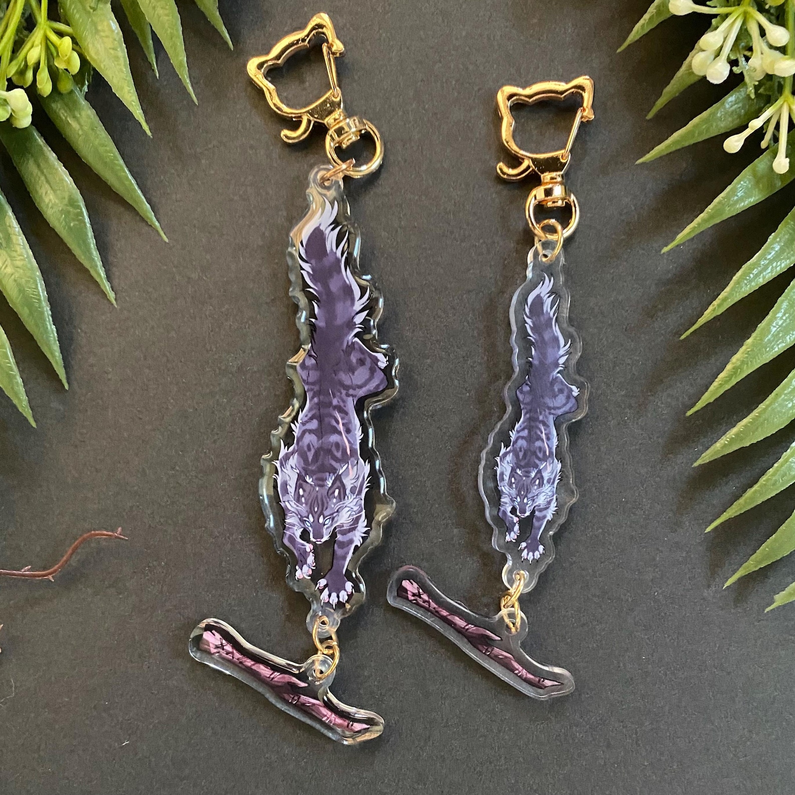 A 3” acrylic epoxy charm based on the Fighting Felines / Battle Cats series! Featuring a double sided design of Jayfeather and his treasured stick!