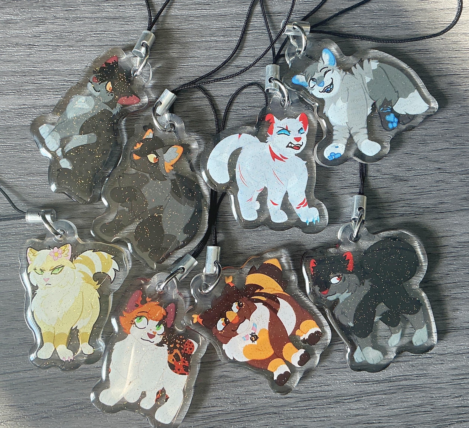 For the bundle options, you can choose any cat from any listing! Just make sure they're in stock or else I'll have to message you about it :) This listing includes all of my Dawn of the Clans phone charms! I plan on making even more soon! Each phone charm is 1.5" with a sparkly glitter epoxy on one side. On the side without epoxy, there is a clear protective film that will need to be peeled off.