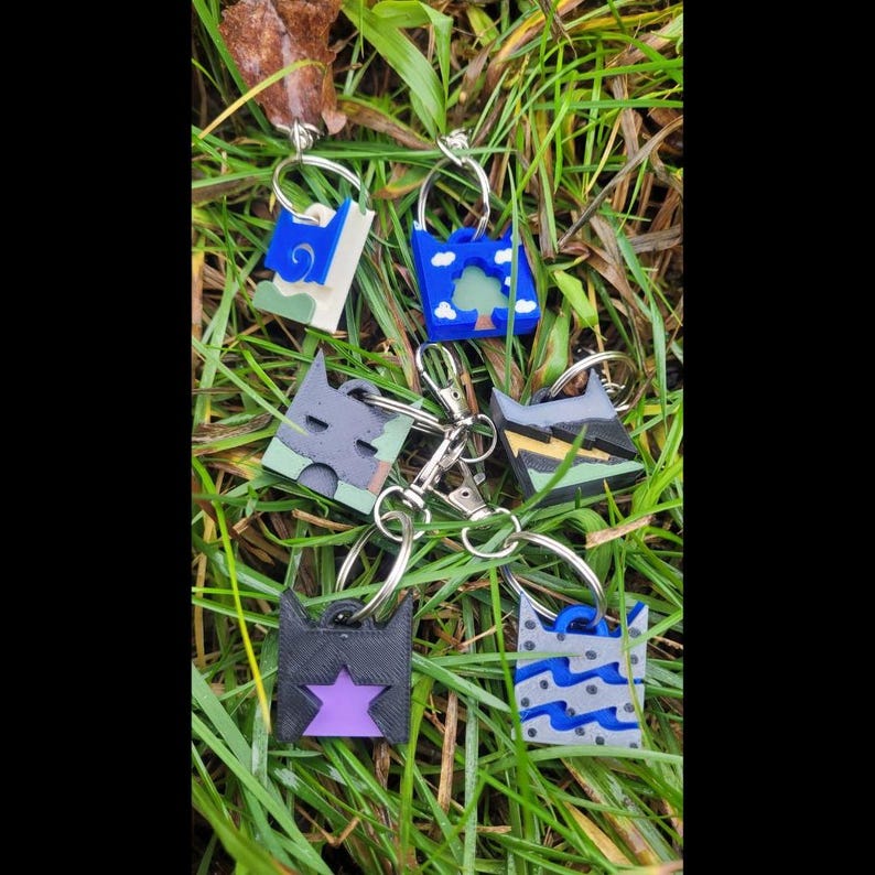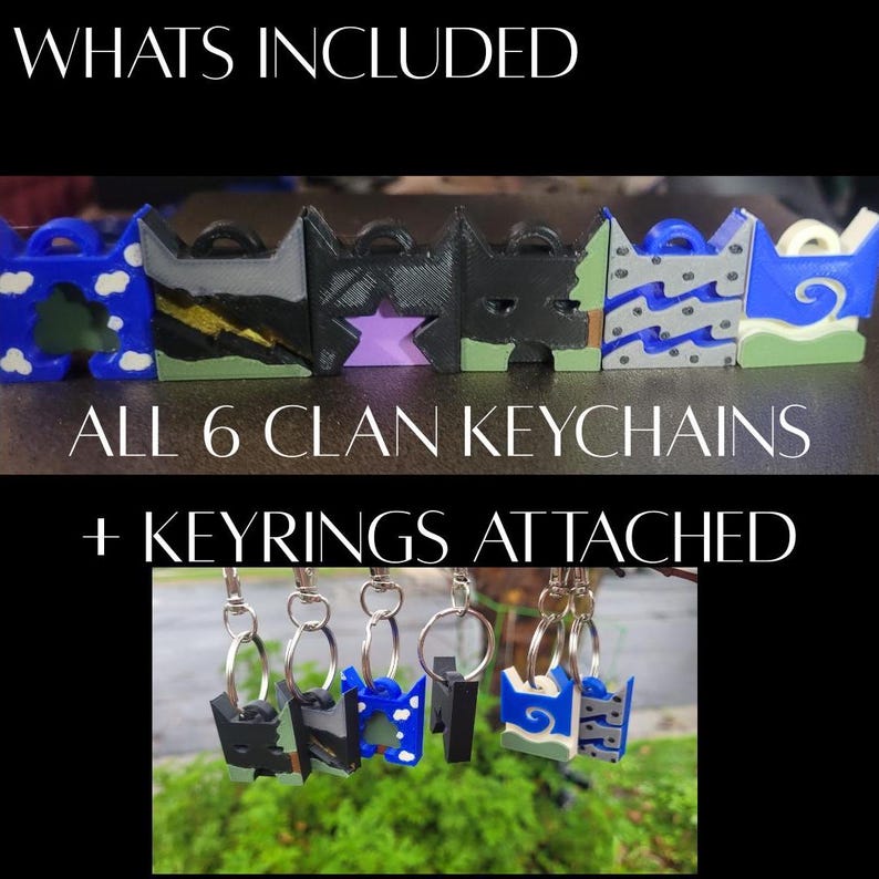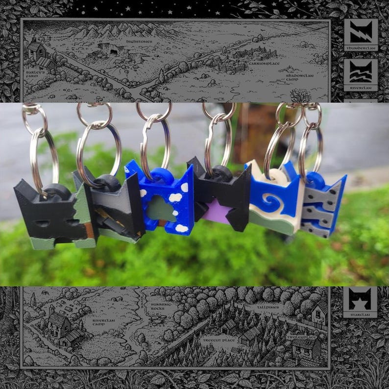 This keychain set includes all 6 main clans from the book series "Warrior Cats"! They are all 3D printed, and include 6 keyrings to make attaching them to a bag easy!