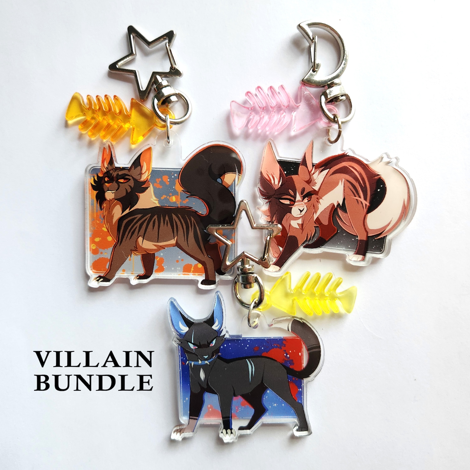 Ashfur (2.5" x 2.5"), Hollyleaf (2.8" x 2"), and Jayfeather (1.5" x 2") one-sided acrylic charm keychains.