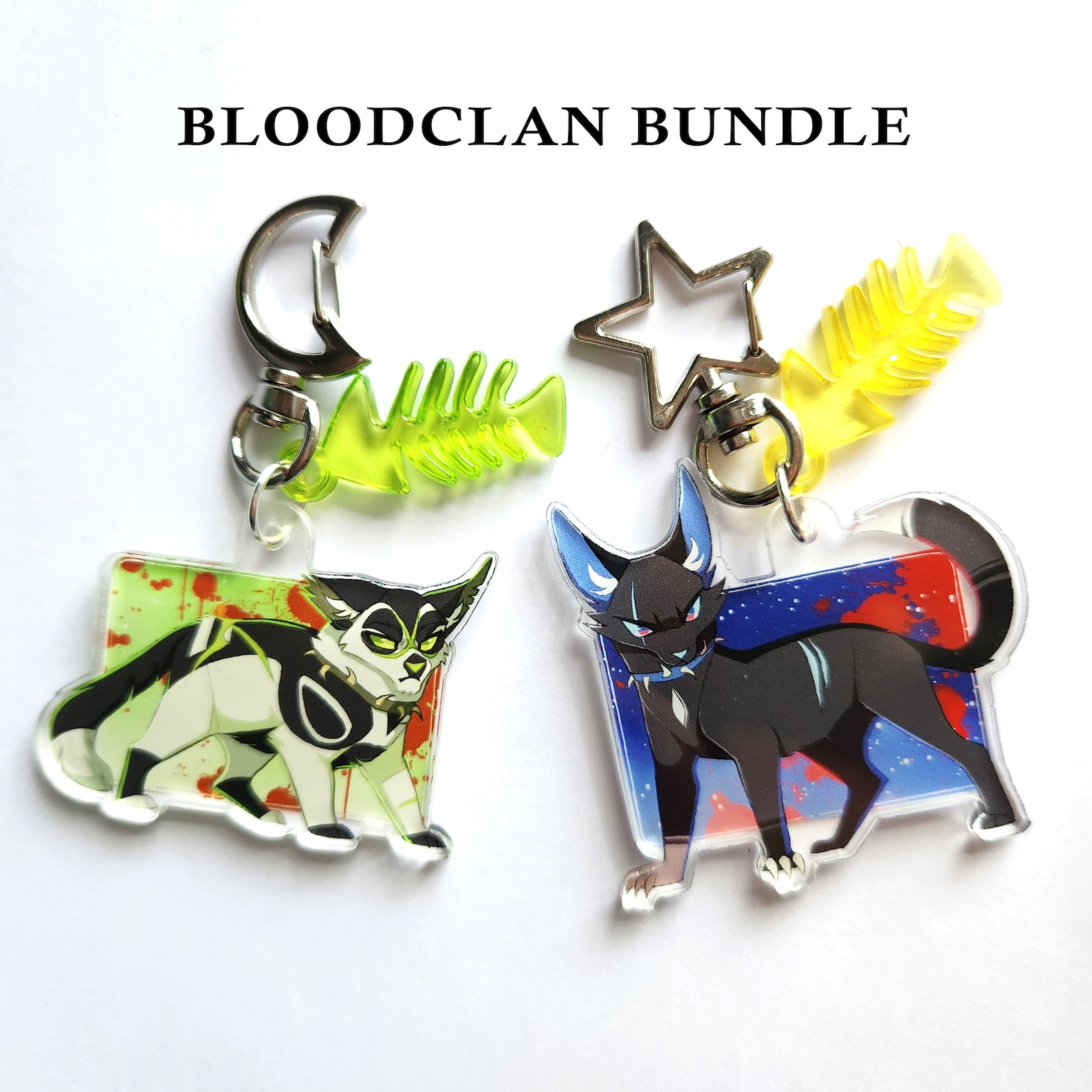 Bone (2" x 1.5") and Scourge (2" x 2") one-sided acrylic charm keychains.